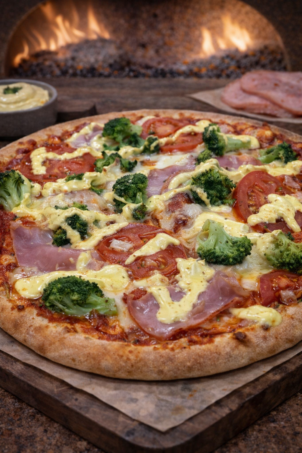 Pizza aus unserem hausgemachten Teig, mit Kochschinken, Tomatensoße, frischen Tomaten, Mozzarella Käse, Brokkoli, Bearnaise