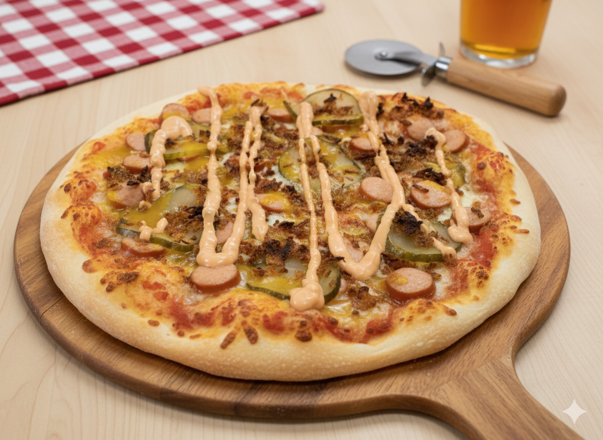 mit Tomatensoße, Käse, Wiener, Burgergurken, Röstzwiebeln, Hot Dog Senf, Mayo-Ketchup Mix