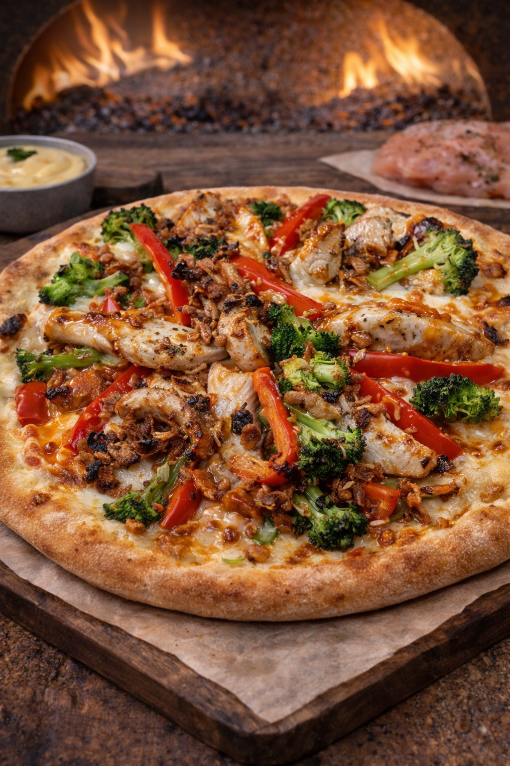 Pizza aus unserem hausgemachten Hefeteig, mit Hollandaise, Käse, Hähnchenfilet, Paprika, Brokkoli, Süß-Sauer Soße, Röstzwiebeln im Steinofen gebacken.