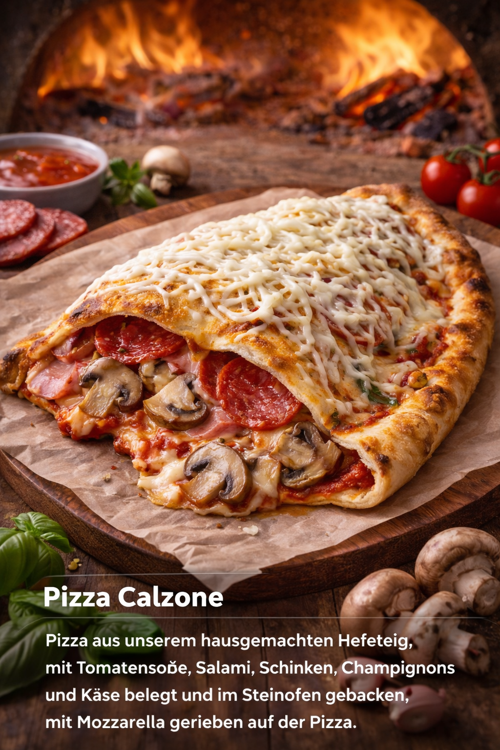 Pizza aus unserem hausgemachten Hefeteig, mit Tomatensoße, Salami, Schinken, Champignons und Käse belegt und im Steinofen gebacken