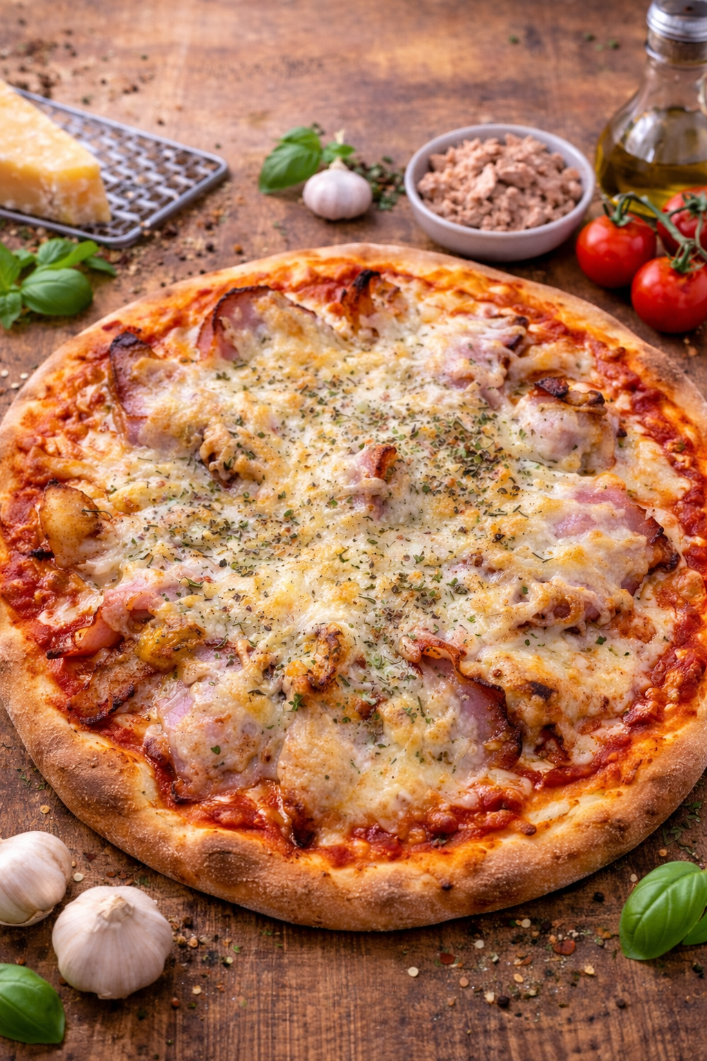 Pizza aus unserem hausgemachten Hefeteig, mit Tomatensoße , Hähnchenfilet und Käse belegt und im Steinofen gebacken.
