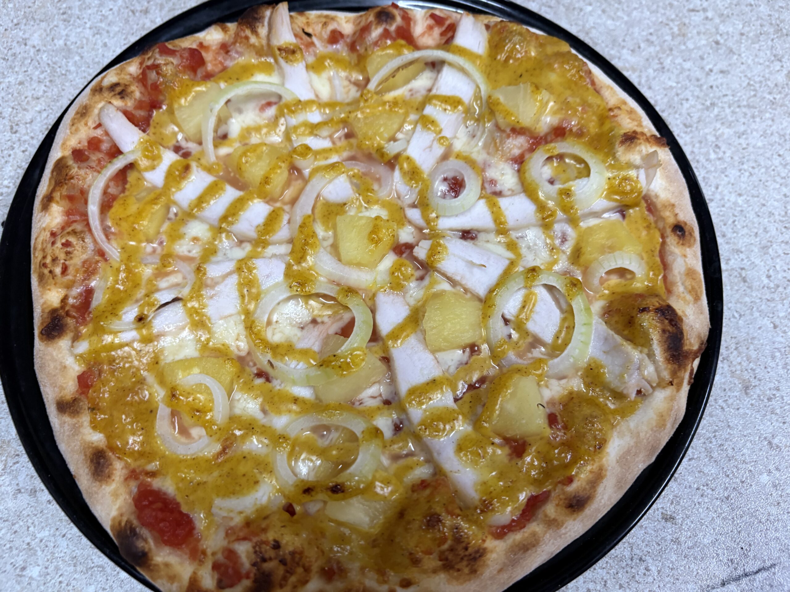 Pizza aus unserem hausgemachten Pizzateig mit Tomatensoße, Hähnchenfilet, Ananas, Zwiebeln, Curry Mango Soße, Bearnaise