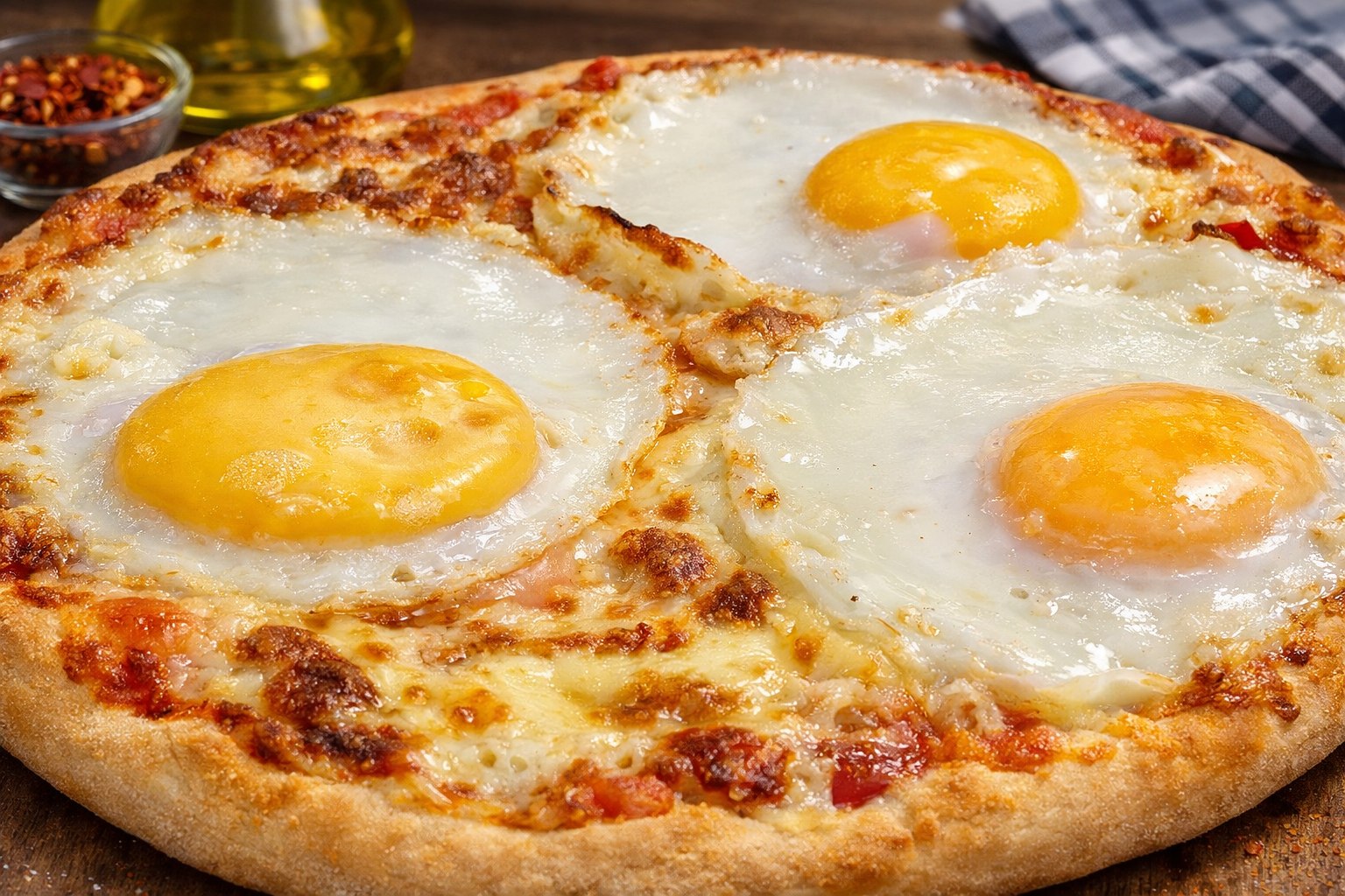 Pizza aus unserem hausgemachten Pizzateig mit Tomatensoße, Mozzarella Käse, Kochschinken, Bacon, 3x Spiegelei und Hollandaise on Top
