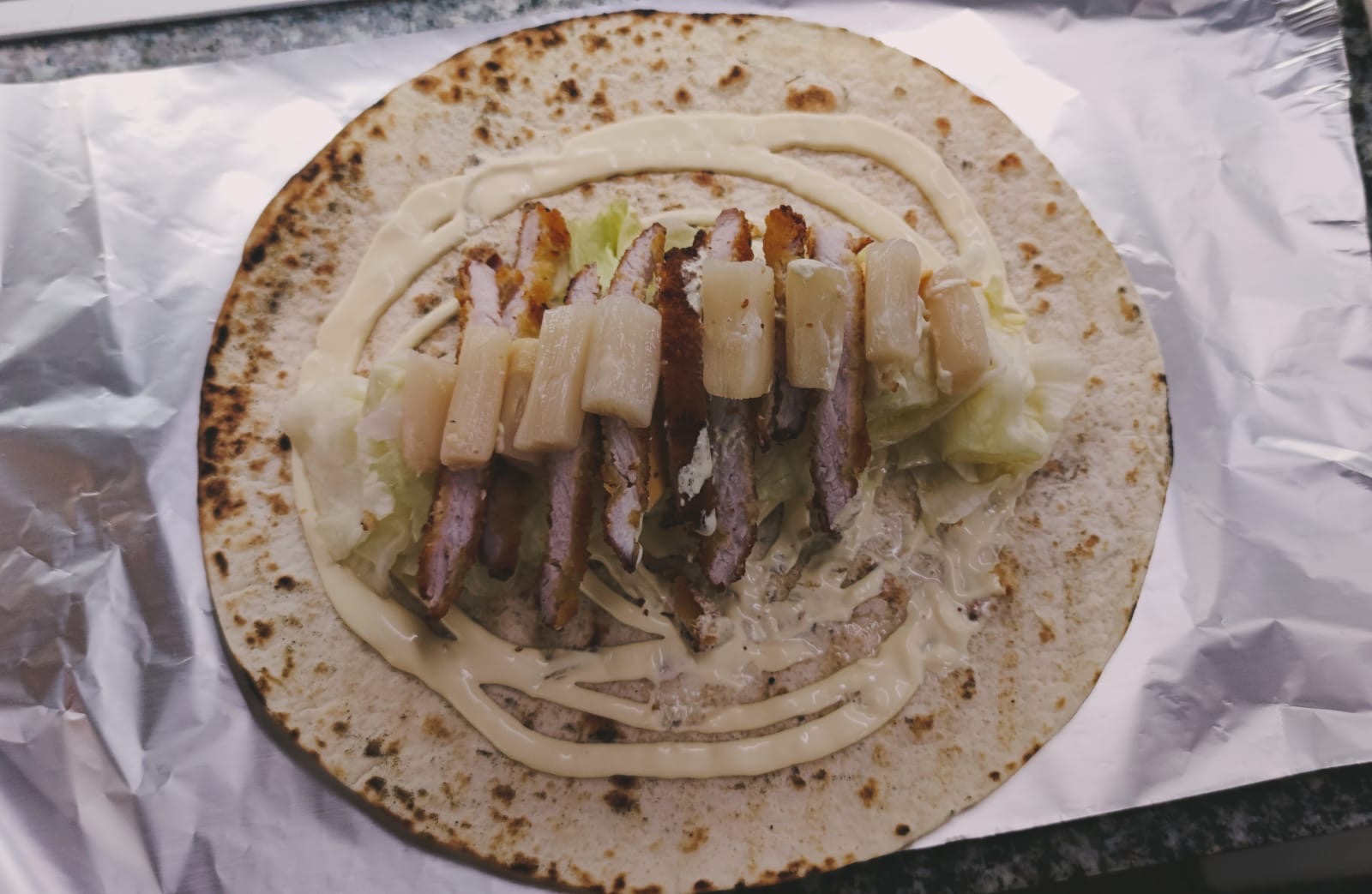 Tortilla mit Salat, Käse, Spargel, Hollandaise und Schnitzel